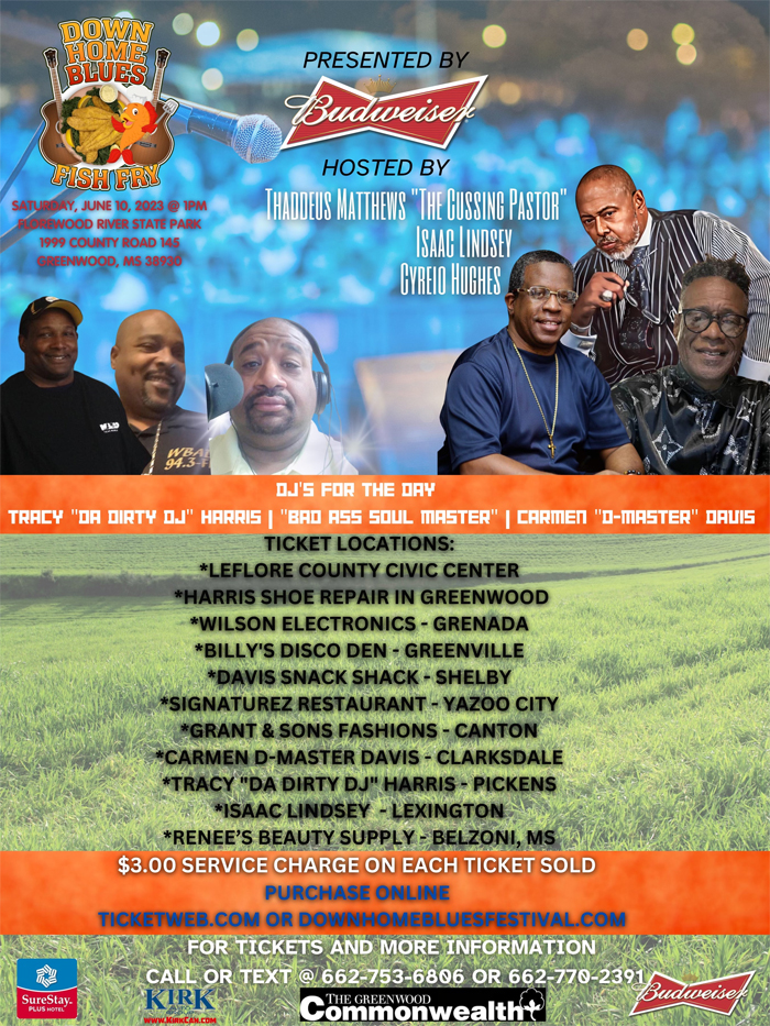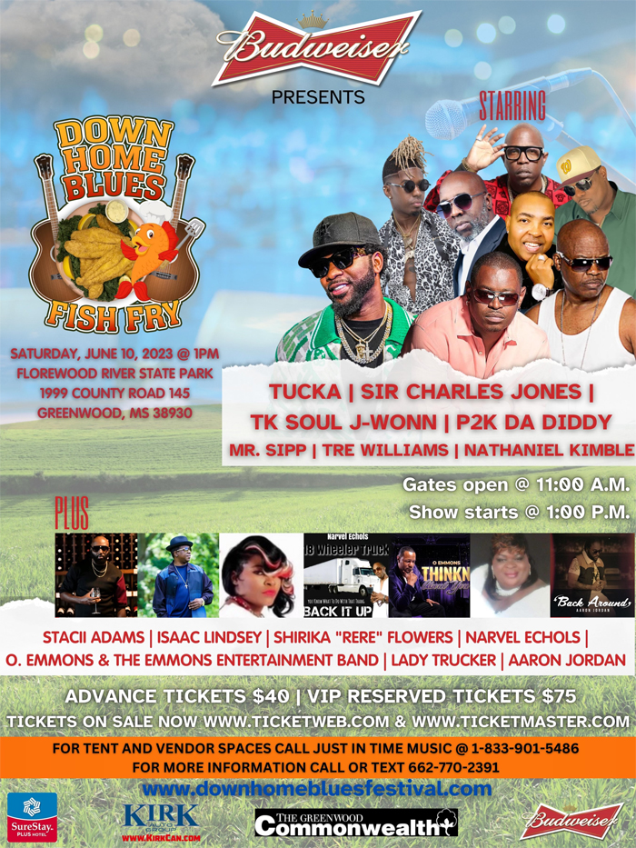 Welcome to the official virtual home of the 2023 DOWN HOME BLUES MUSIC FESTIVAL with an OLD FASHIONED FISH FRY produced by Just In Time Music and the Soul Music Experience! This marks our 3rd annual gathering Saturday, June 10, 2023 at 1PM returning to the beautiful Florewood River State Park located 1999 County Road 145 in Greenwood, Mississippi.